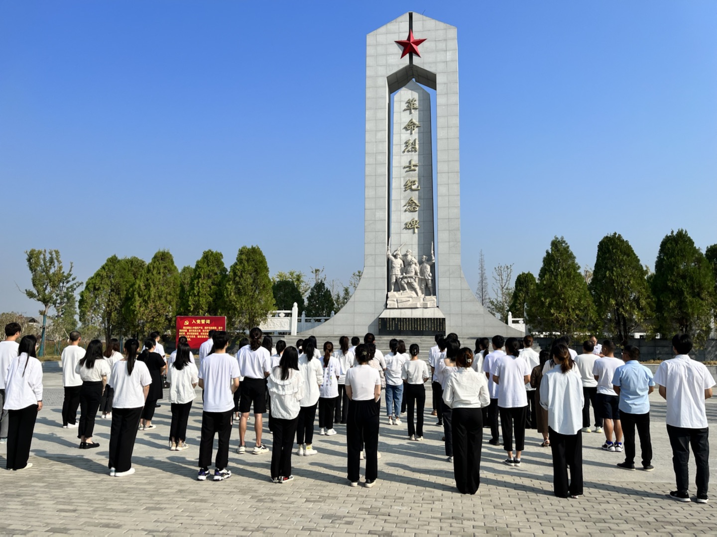 “烈士纪念碑高19.24米,寓意拖船埠的革命活动起始于1924年;基座宽3.31米,象征着在这里牺牲的331名烈士。”讲解员肖蒙蒙向师生们介绍拖船埠村的红色历史。