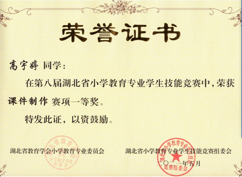 高宇婷同学获湖北省小教专业课件制作赛项一等奖