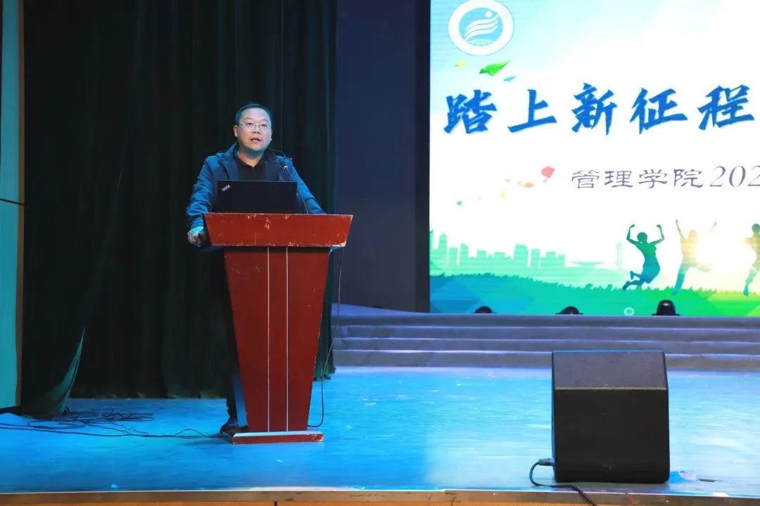 最后,徐健耕院长代表管理学院的全体教职工向每一位新同学表示热烈的欢迎和诚挚的祝福!徐院长表示,大学有诗和远方,有广阔的时间和空间,蕴含无限的可能,希望大家心中要有目标要有方向,做奔流不息,勇往直前的“后浪”。
