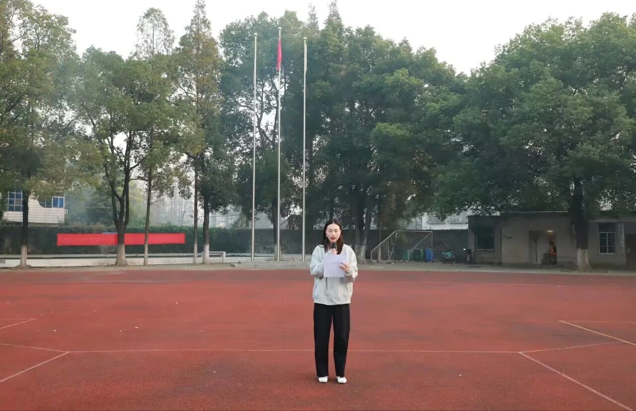 迎着朝阳,国旗护卫队迈着铿锵有力、整齐划一的步伐护送五星红旗至升旗台。伴随着激昂雄壮的《义勇军进行曲》,五星红旗在晨光中冉冉升起,全体师生行注目礼,奏唱国歌,为祖国献上最真挚的祝福。