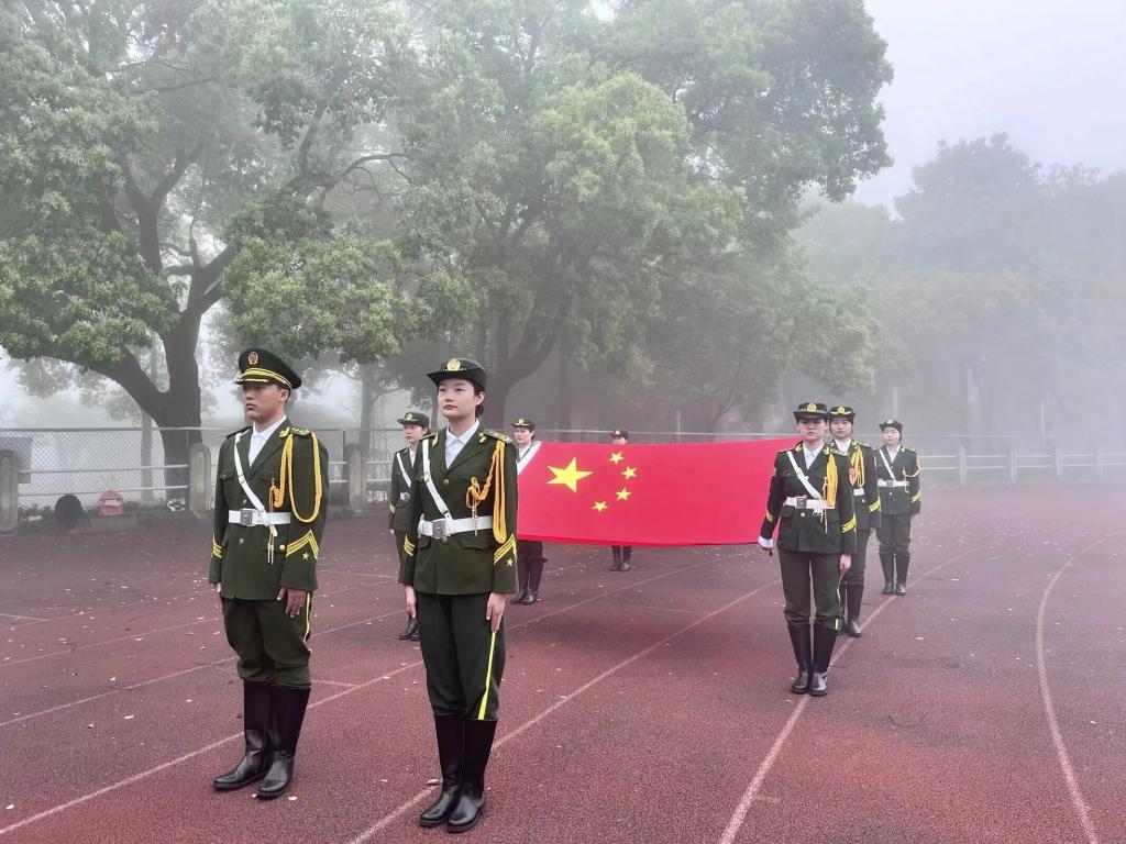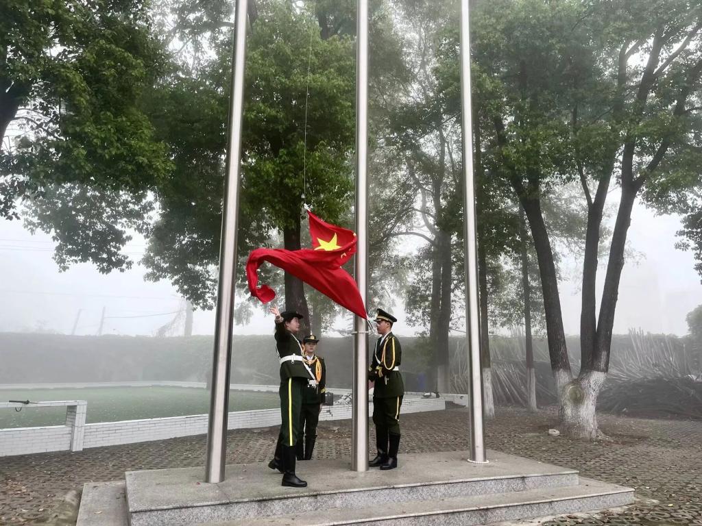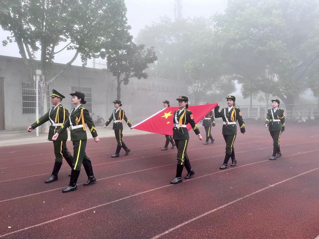 英姿飒爽的国旗护卫队迈着铿锵的步伐走向国旗台前,五星红旗伴随着雄壮激昂的义勇军进行曲冉冉升起,全体师生庄严肃立,行注目礼。