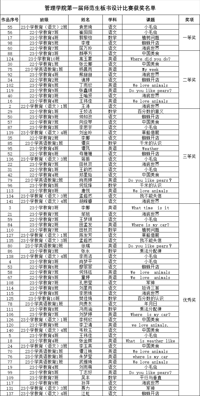 自活动启动以来,全院学生积极响应,用粉笔勾勒思维的轮廓,用色彩填充知识的框架。每一幅板书不仅是教学内容的直观展现,更是教师教育理念与艺术审美的完美融合。本次活动特邀请了设计学院刘强、马犇老师,龙虾产业学院李雅雯老师,管理学院田静老师担任评委,经过激烈角逐与专业评审,一系列匠心独运、构思巧妙的板书脱颖而出。