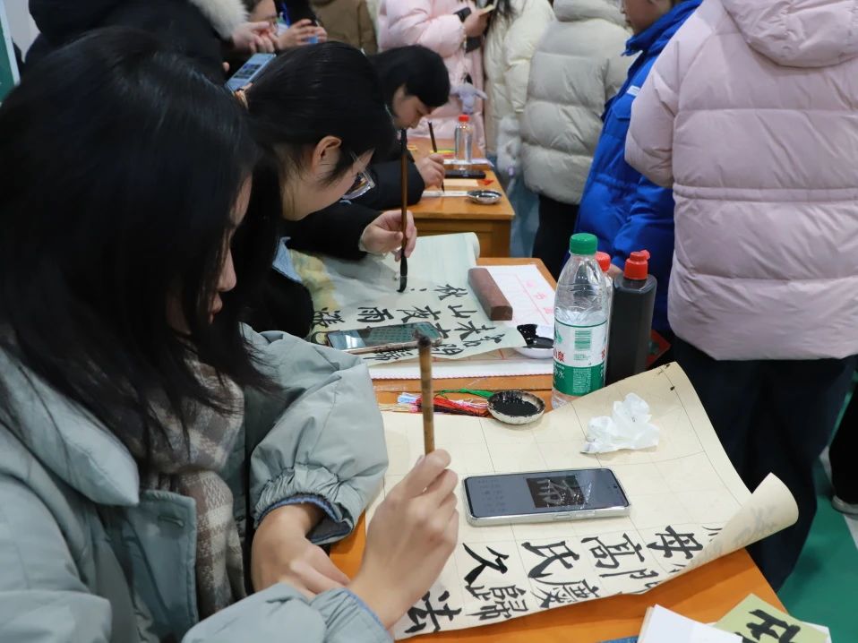 同学们也接踵而至,纷纷与书法者互动交流,有的还亲自拿起毛笔,体验书法的乐趣。现场翰墨飘香,气氛热烈,为双选会增添了一道独特而亮丽的文化风景。