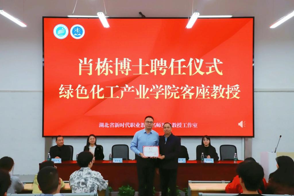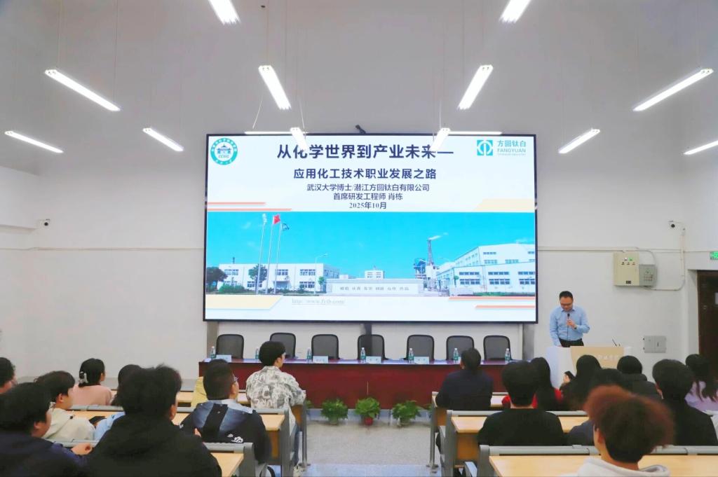 为深化产教融合,助力人才培养。10月22日晚,潜江方圆钛白有限公司首席研发工程师肖栋博士受聘仪式暨学术交流讲座在beat365在线体育官网登录入口绿色化工产业学院25-244教室成功举办。24级、25级应用化工专业全体师生参加。