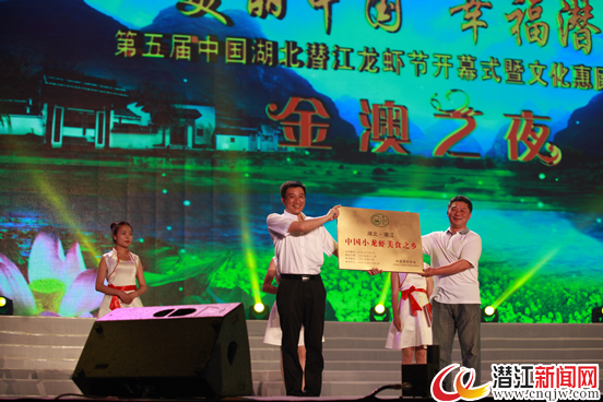 开幕式上,中国烹饪协会副会长卢永良宣读《中国烹饪协会关于授予湖北省潜江市“中国小龙虾美食之乡”荣誉称号的通知》,并为我市颁发“中国小龙虾美食之乡”牌匾。