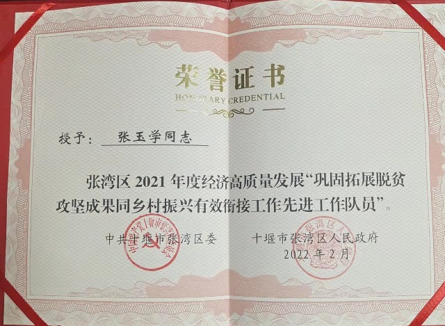 近日,在十堰张湾区2022年经济工作会上,beat365在线体育官网登录入口驻村工作受肯定,驻村第一书记张玉学荣获张湾区2021年度经济高质量发展“巩固拓展脱贫攻坚成果同乡村振兴有效衔接工作先进工作队员”称号。
