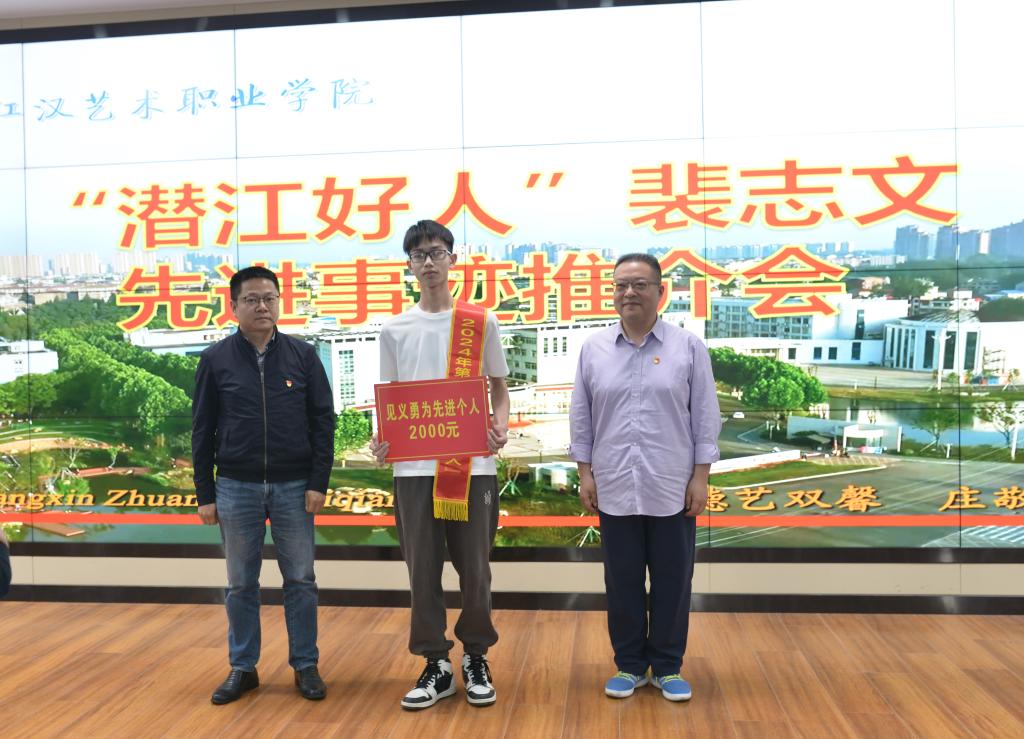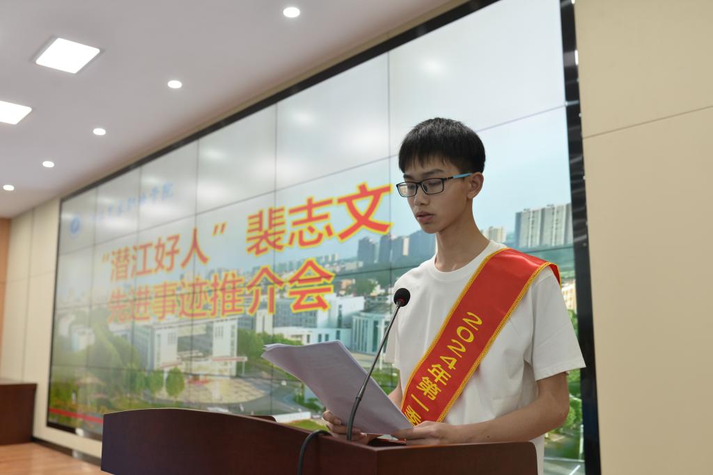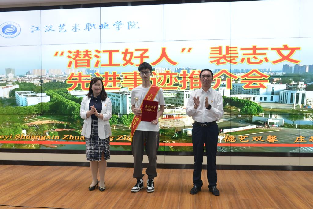 设计学院院长熊伟称赞其以实际行动生动诠释了见义勇为的崇高精神。学工部杜继锋部长宣读学校授予裴志文“见义勇为先进个人”称号的决定,市文明办刘洋科长宣读了市文明办“潜江好人”公示文件。