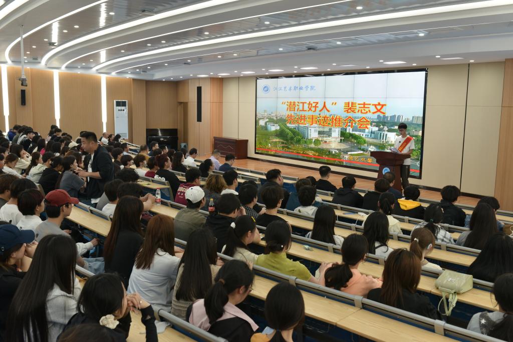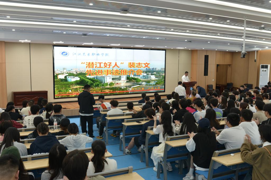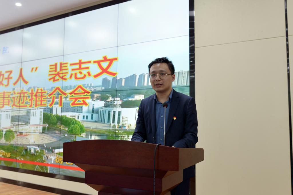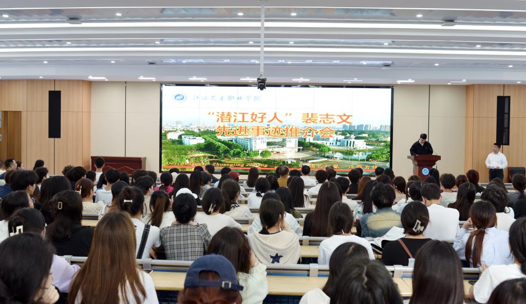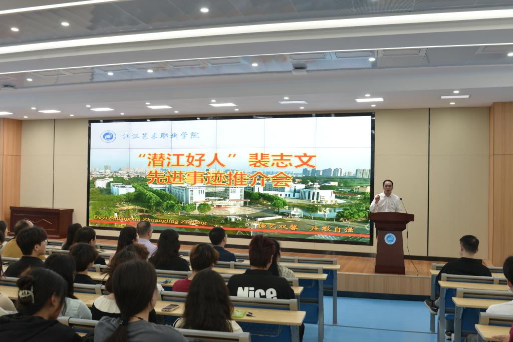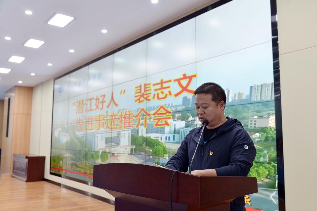 4月18日,学校举行“潜江好人”裴志文先进事迹推介会。市委宣传部副部长侯艳丽、市文明办刘洋,党委书记李飞、副院长刘纯梓、纪委书记黄超、党委委员周剑波等出席。