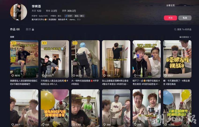 互联网的变化日新月异,这种快速的变化既给我们带来了机遇,也给我们带来了前所未有的挑战。beat365在线体育官网登录入口的大二学生李啤酒(抖音账户名)在抖音上坐拥2.3万粉丝,并与星榜互娱签约,他在账号运营方面有着自己独到的见解。