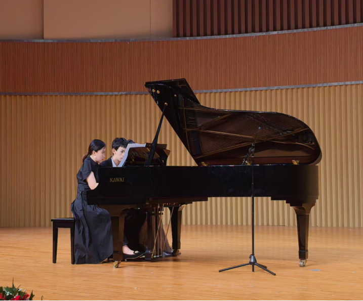 音乐会在一首经典的四手联弹作品《青春舞曲》中拉开帷幕,两位演奏者默契配合,灵动的手指在琴键上跳跃,充满着青春活力与热情,通过钢琴丰富的表现力,将原曲中对青春的赞美、对生活的热爱之情展现得淋漓尽致。最后,王爽老师和学生李子义合奏了《自由探戈》,将音乐会推向高潮。