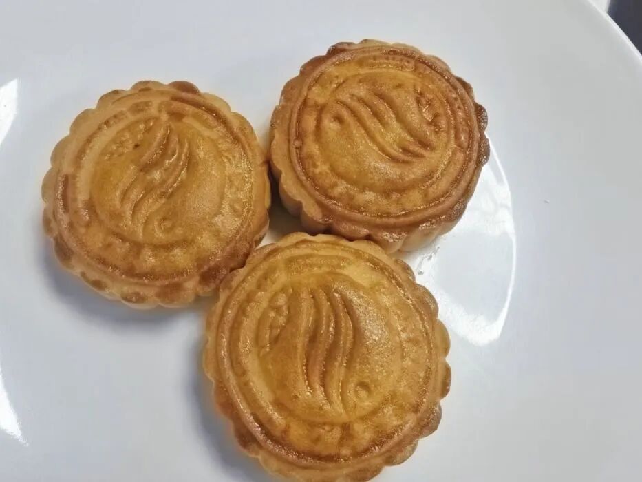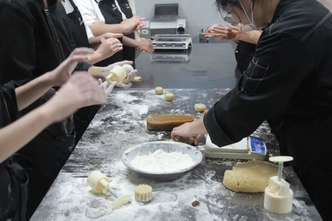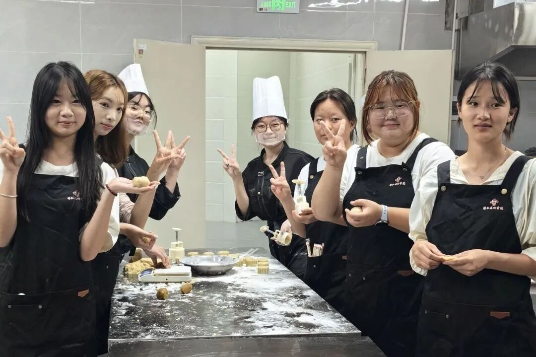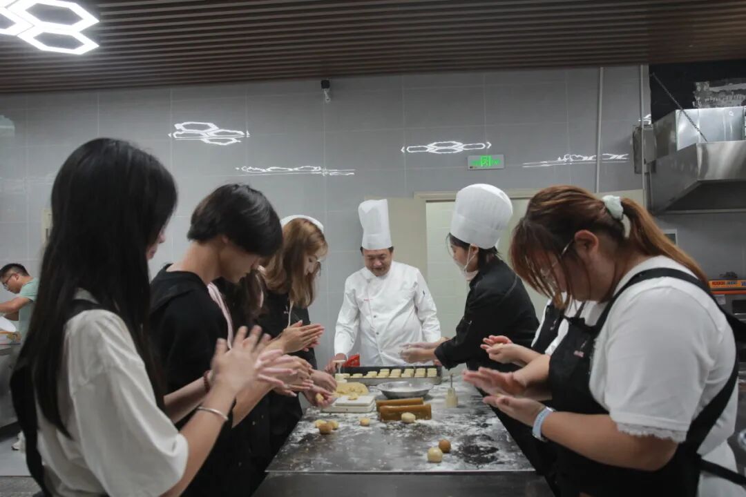 座谈会后,同学们移步烹饪演示阶梯教室,参加月饼制作体验活动。在专业烹饪教师的指导下,同学们纷纷化身“校园糕点师”,兴致盎然地称重、和面、包馅、压模。专注的眼神、协作的身影与欢快的笑声交织在一起。