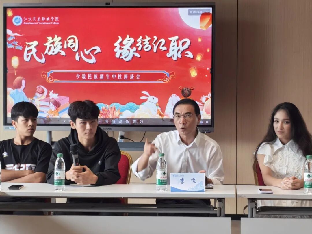 李飞在交流中深情寄语:“中秋节是中华民族重要的传统节日,承载着团圆、和谐、美满的美好寓意。看到来自不同民族的同学们在江职这个大家庭里融洽相处、共同成长,我深感欣慰。学校将始终坚持以生为本,为每一位同学的成长成才创造更好条件。希望同学们珍惜大学时光,既要勤学专业知识,也要积极传承中华优秀传统文化,在交流交融中铸牢中华民族共同体意识,共同建设我们美好的校园。”