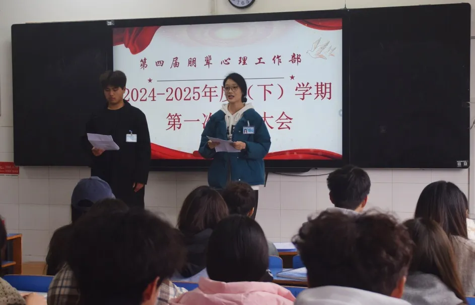 2025年2月28日,朋辈心理工作部在10B-110举办“心田开花时”春季全体大会,参会人员有心理健康教育中心专职教师李国珍、李琴老师及朋辈心理工作部全体成员。