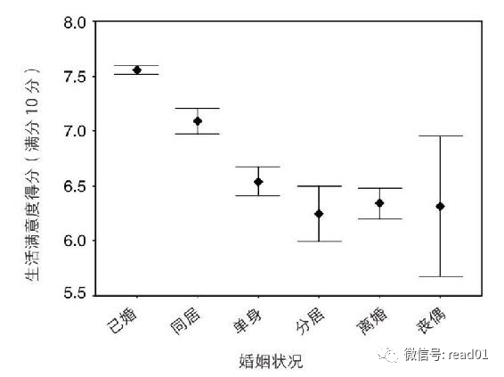 已婚人士的幸福度要比未婚人士高得多,同居人士幸福度较已婚人士稍低,而单身人士则排在第三位。平均而言,幸福度最低的是结过婚但是离婚、分手或丧偶的人群。