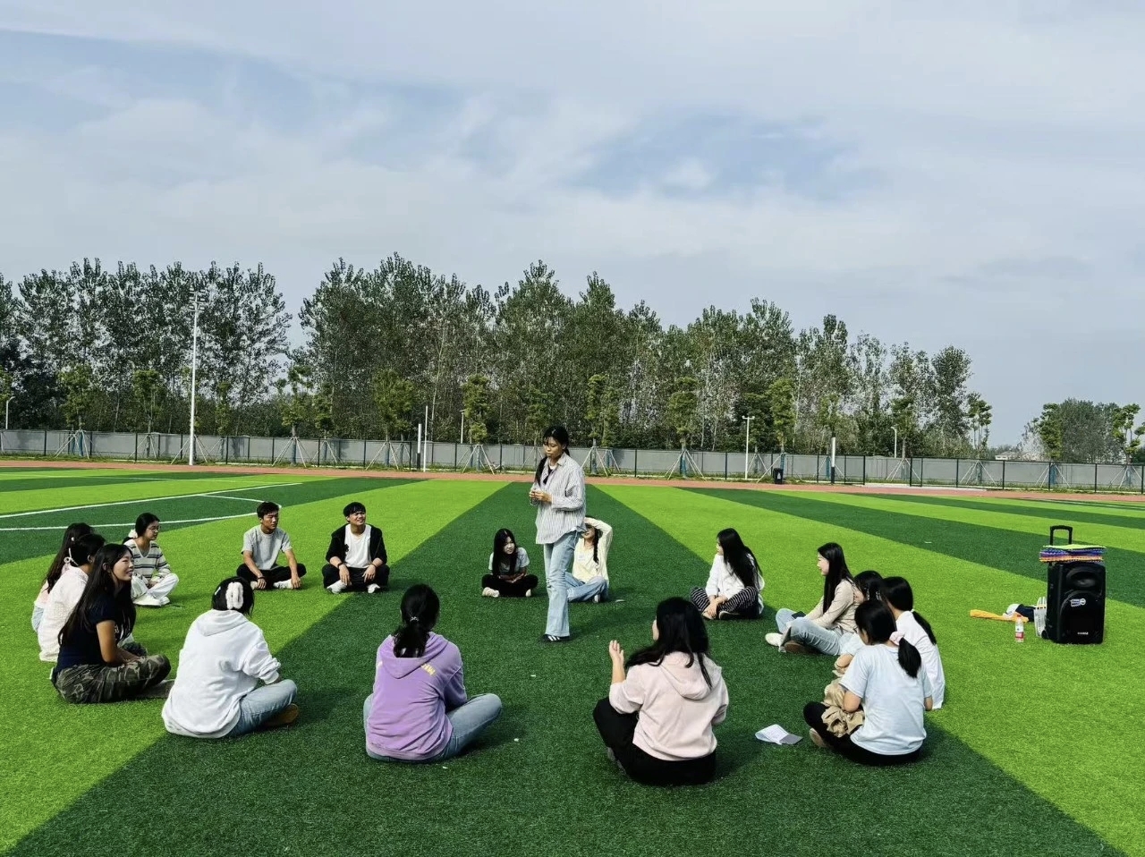 等游戏收了尾,大家喝着水唱着歌,音乐会的旋律一飘出来,刚熟络的大家干脆坐成一圈跟着哼。有人跑调跑得离谱,旁边的人就跟着一起“歪”,晚风里全是跑调的歌和没停过的笑——原来从陌生到熟稔,不过一场游戏、一首歌的距离呀。