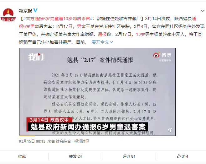 陕西13岁少年杨某,趁着家中无人,将一名6岁男孩诱骗到家中,用钝器和刀具虐杀。
