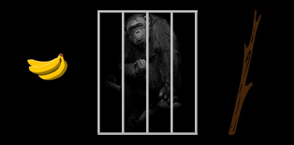 在这个任务里面,黑猩猩被安置在笼子里面,笼子外面是香蕉。香蕉放得不远不近,刚好是黑猩猩能够看得很清楚,但是怎么够都够不着的距离。在这个笼子的另外一边,放着一根长长的棍子。以黑猩猩的智力,它完全可以拿起这根棍子,去够到那根香蕉。