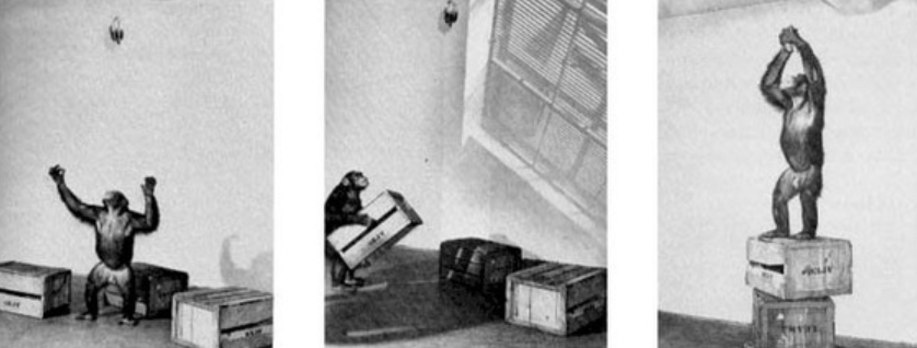 所以,可以看到,图中的黑猩猩想要吃香蕉。但是,香蕉挂得太高了它没有办法直接够到。它先把一个箱子搬过来,发现还是够不到,于是它把两个箱子摞起来。这一次,它终于够到了香蕉,解决了问题。