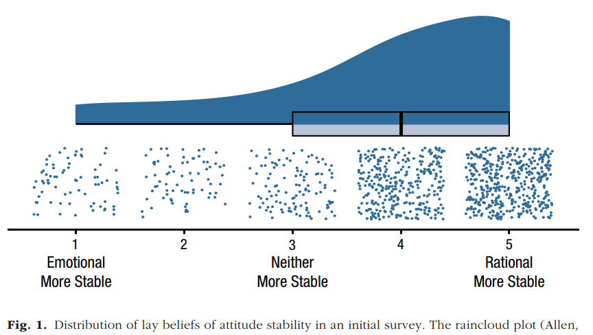 研究者首先对稳定性的信念进行了初步调查,从亚马逊的Mechanical Turk中招募了大约1000多名参与者,给他们0.05美元来回答一个五分量表形式的问题,探究他们基于感觉或情绪反应的评估还是基于思考和理性分析的评估更稳定的态度,研究者故意在量表中加入了一个中点,即参与者可以认为这两种态度可以同样稳定。