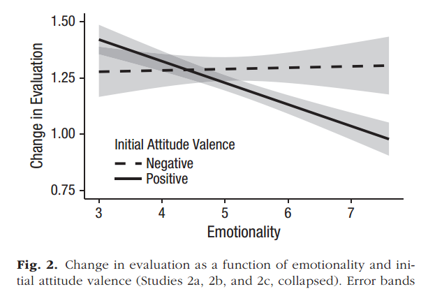 研究人员一直在质疑说服的持久效果,进一步做了使研究者能够进一步探讨情绪的因果效应的实验。每个参与者被随机分配阅读一条关于一个虚拟的水生动物的信息,并且这条信息被设计用来激发或高或低的情绪。对结果进行分析发现与低情绪组相比,高情绪组的态度确实具有更多的情绪特征。