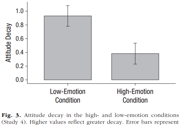 研究发现情绪性可靠地预测更持久的态度,特别是积极的态度。此外,情绪性预示着人们通过口口相传来表达他们的态度时更大的一致性,而用灌输的方式唤起更大的情绪性态度随着时间的推移衰退得更少,这种效果出现在极端、确定性、矛盾心理和知识的影响之上。此外,情绪模型表明,当我们控制个体差异时,这种效应仍然存在,这些差异可能与情绪和稳定性有关。伴随体验而来的积极情绪比消极情绪随着时间的推移消失得更少。