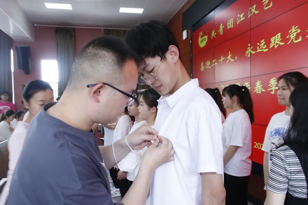 团委全体老师及院部团总支书记为新团员戴团徽。