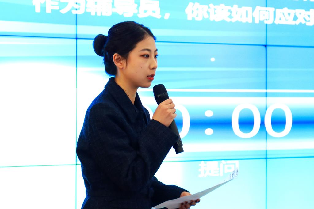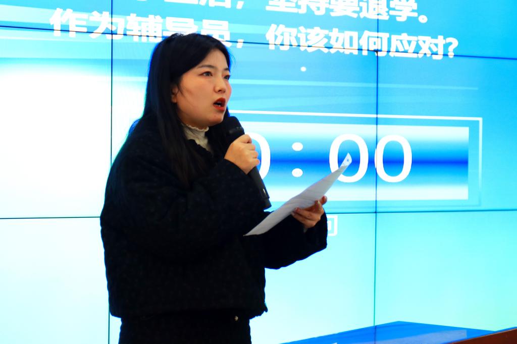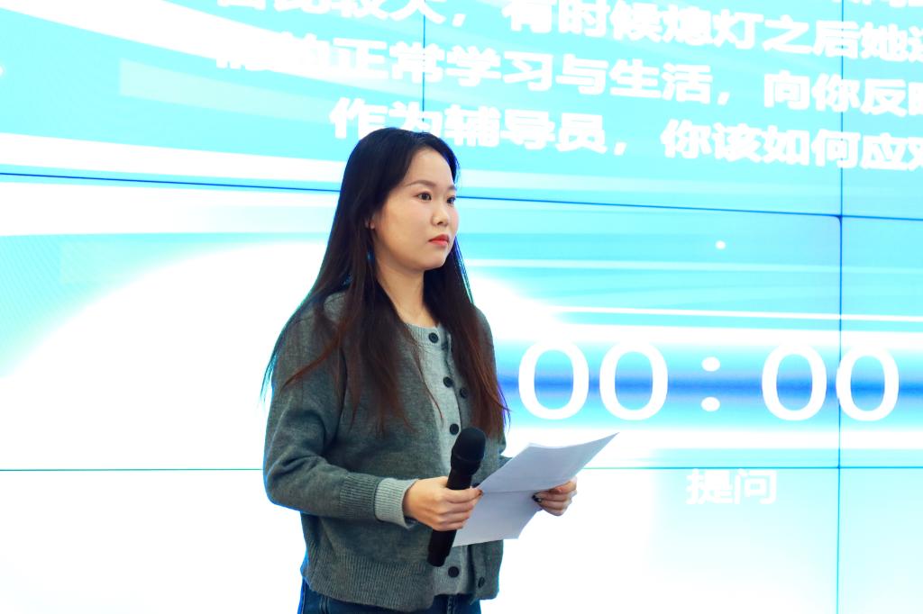 决赛“案例研讨”环节,以每组两位选手通过“我提问,你回答”的问答研讨形式,紧扣辅导员工作中思想政治教育、日常管理、价值引领、学风建设等领域的典型案例展开。主要考察辅导员分析问题、思考问题、研判问题、解决问题以及理论学习应用能力。参加决赛的12名选手,结合案例情境,就辅导员工作中涉及的理想信念教育和价值引领、学风建设、危机事件应对与处理、安全教育管理、学业指导、就业指导、党团班级建设等各类工作内容,辨析原因、探讨对策、阐述相关启示并总结规律。参赛的辅导员老师们既是对手,又要联手;既是合作者,又是竞争者;既要出招,也要接招。