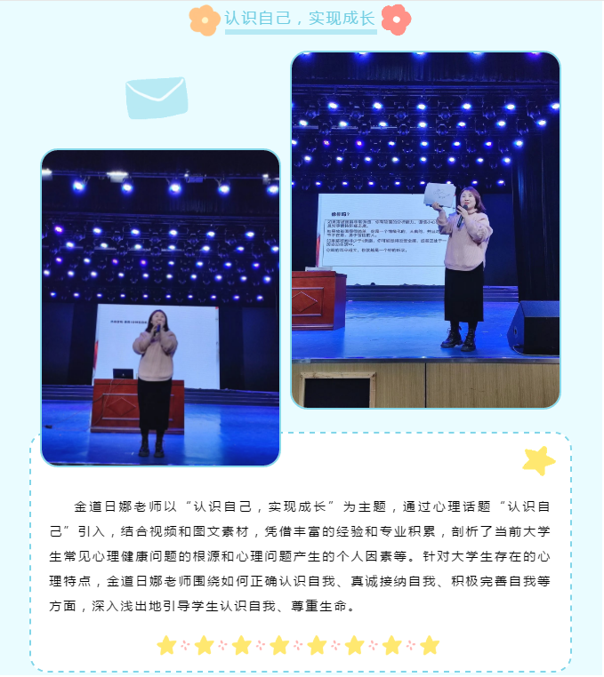 为培养学生良好的人际关系和健全的人格,促进其身心健康发展。3月23日晚,心理健康中心副主任国家二级心理咨询师刘濛和中心专职教师金道日娜在风华剧场为管理学院大二学生进行了心理健康专题讲座。