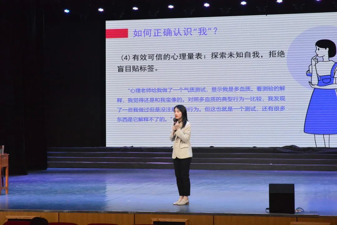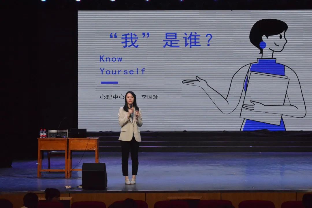 心理健康中心李国珍老师关于“我是谁”的话题展开了演讲。期间,李老师让同学们用“我”做主语表达出对“我”的认识。随后又讲述了关于猩猩实验的故事,让同学们更加明确如何正确客观的了解自己。最后关于如何正确的认识自己,李老师提出了一些建议,让同学们独立思考拒绝偏见。