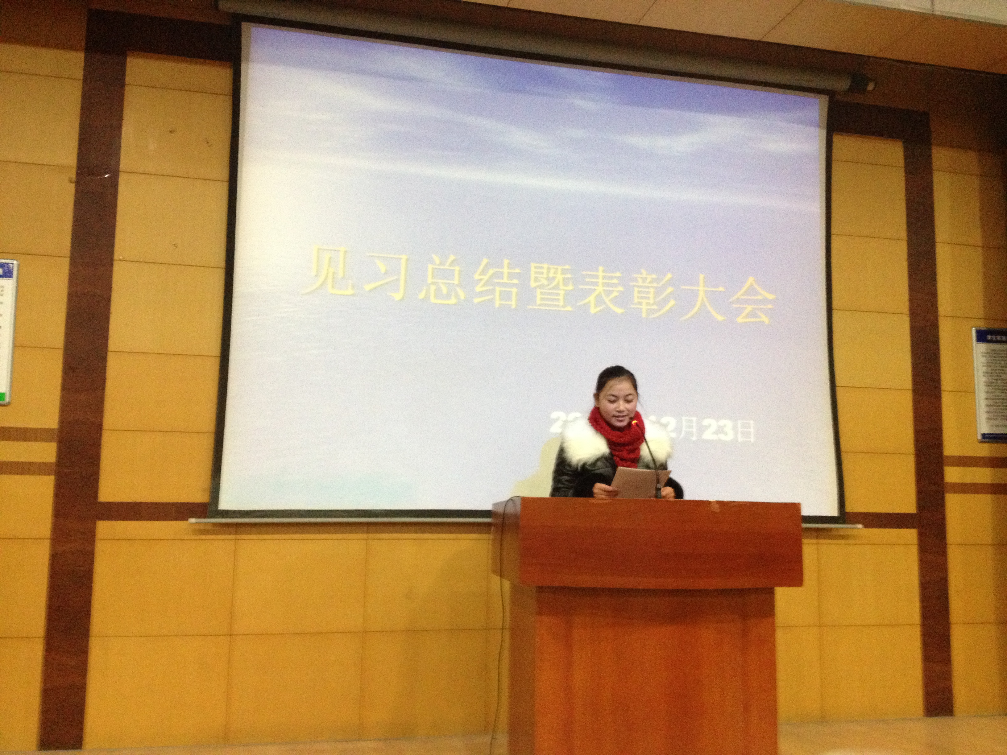 为总结此次活动,表彰激励优秀见习生,12月23日晚7点半,中专部在综合楼201教室召开了本学期的见习总结及表彰大会,表彰了王一鸣、严先慧、王颖等十二名优秀见习生。三个班级的优秀见习生代表李梦琪、李娜娜、袁兵娥分别发言,分享他们的见习所得,袁冰娥同学以自己的指导老师郑老师为榜样,决心投身幼教事业的热情深深地感染了在场的师生。最后,王祖艳副主任代表中专部领导作了见习总结,对学生们提出了殷切的希望,希望同学们能带着对幼师这个职业的巨大热情,努力,努力,再努力,抓住剩余的时光,在校打好本领,在以后的职业生涯中赢得更多的鲜花与掌声。