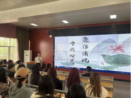 徐老师以《廉洁清风,净我心灵》为主题,以北宋理学家周敦颐的《爱莲说》为切入点,从“知廉洁、懂廉洁、践廉洁、倡廉洁”四个方面深入浅出的让学生了解廉洁文化的丰富内涵,强调了廉洁的重要性,以及弘扬廉洁之风与每个人息息相关,吾辈青年当厚植清廉文化,涵养清风正气。在风浪考验中立住脚,在诱惑围猎前定住神,塑造勤廉品格,彰显青年面貌。黄超书记指出,本次班会内容设计精妙,环节紧密相扣,涵盖了与学生学习生活密切相关的多个层面,生动而深入地揭示了廉洁正直品质的至关重要性,使同学们对清正廉洁的核心理念有了更深层次的理解和认知;同时强调,学校作为廉洁文化的重要承载地,我们应当积极且扎实地推进校园廉洁文化建设工作,充分发挥廉洁文化深入人心、滋养品德、教育引导的独特作用,让廉洁的理念如同种子般深深根植于每一位学子的心田,让廉洁之风吹拂整个校园,营造出浓郁的廉洁风气。