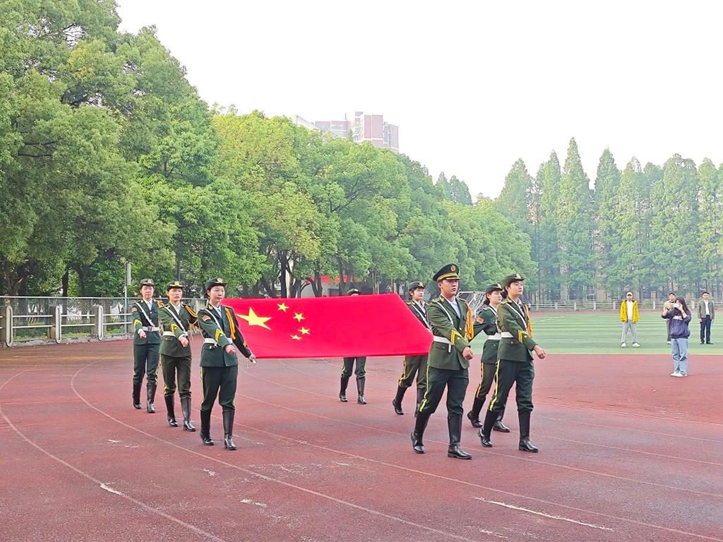 迎着朝阳,国旗班队员们迈着整齐划一、铿锵有力的步伐,护卫着鲜艳的五星红旗走向国旗台。笔挺的军姿,有力的摆臂,坚定的脚步,展现出时代青年昂扬的风采。