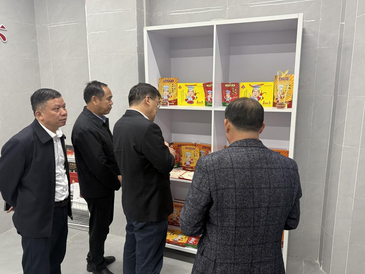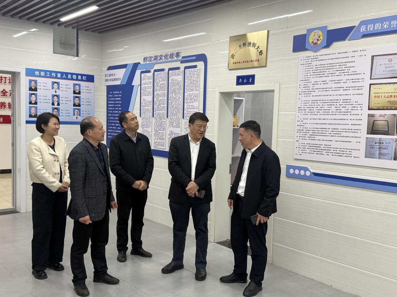 小李子工作室作为潜江龙虾产业学院实施产教融合的核心实践基地,是链接产业、培育人才、传承文化的重要平台。冯家欣副主席一行首先参观了工作室文化墙,通过图文资料系统了解了油焖大虾的发明起源、潜江龙虾产业的发展历程,以及学院与工作室协同推进技艺传承的实践路径。