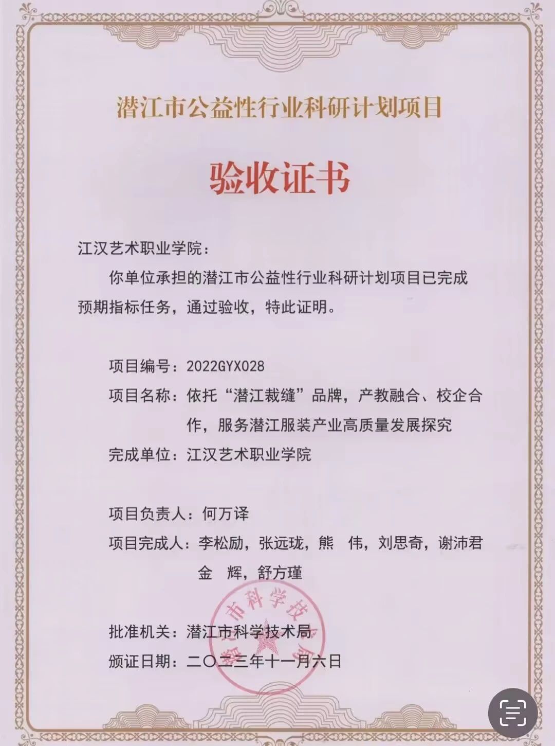 近日,我院何万译副教授主持的潜江市公益性行业科研项目《依托“潜江裁缝”品牌,产教融合、校企合作,服务潜江服装产业高质量发展探究》通过结题验收,顺利结题。