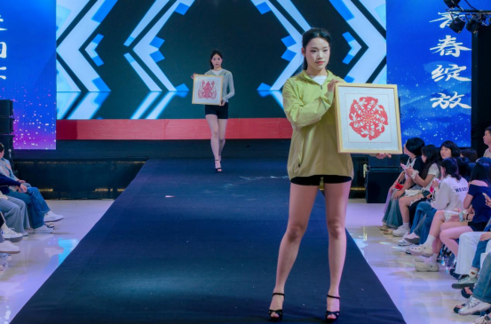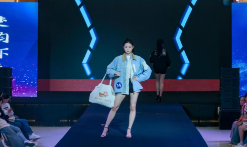 大赛现场,42组服装作品分环节惊艳亮相。形体展示环节中,选手们身着简约修身服饰,凭借挺拔身姿与自信台风,将形体美展现得淋漓尽致,纯粹的肢体语言配合动感音乐,瞬间点燃现场气氛;在户外服与文创展示环节,选手们化身文化使者,手持非遗剪纸、龙虾文创模型、掐丝珐琅饰品等道具,或轻快奔跑,或俏皮互动,在传递地域文化符号的同时,让剪纸的精巧、文创的趣味、珐琅的华贵一一呈现。展示间隙,音乐学院学生带来精彩表演,悠扬的歌声与灵动的舞蹈穿插其中,为紧张的比赛增添艺术氛围;压轴的礼服展示环节,选手们身着重工刺绣的华美礼服,绸缎流光溢彩,针脚细腻繁复,将东方韵味与现代剪裁完美结合。