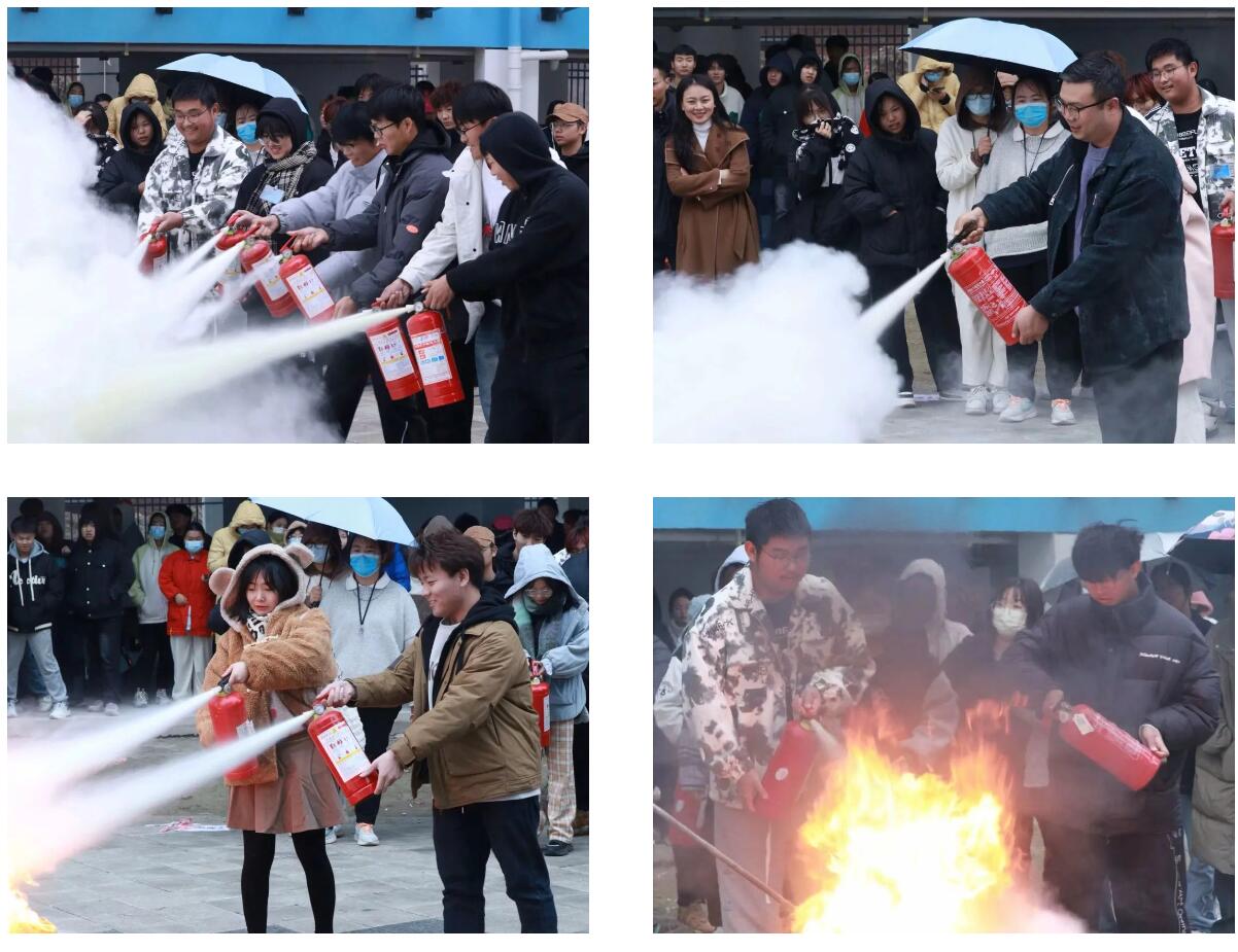 保卫处工作人员现场讲解、演示灭火器的使用方法及步骤,并选出师生代表进行实操演练。