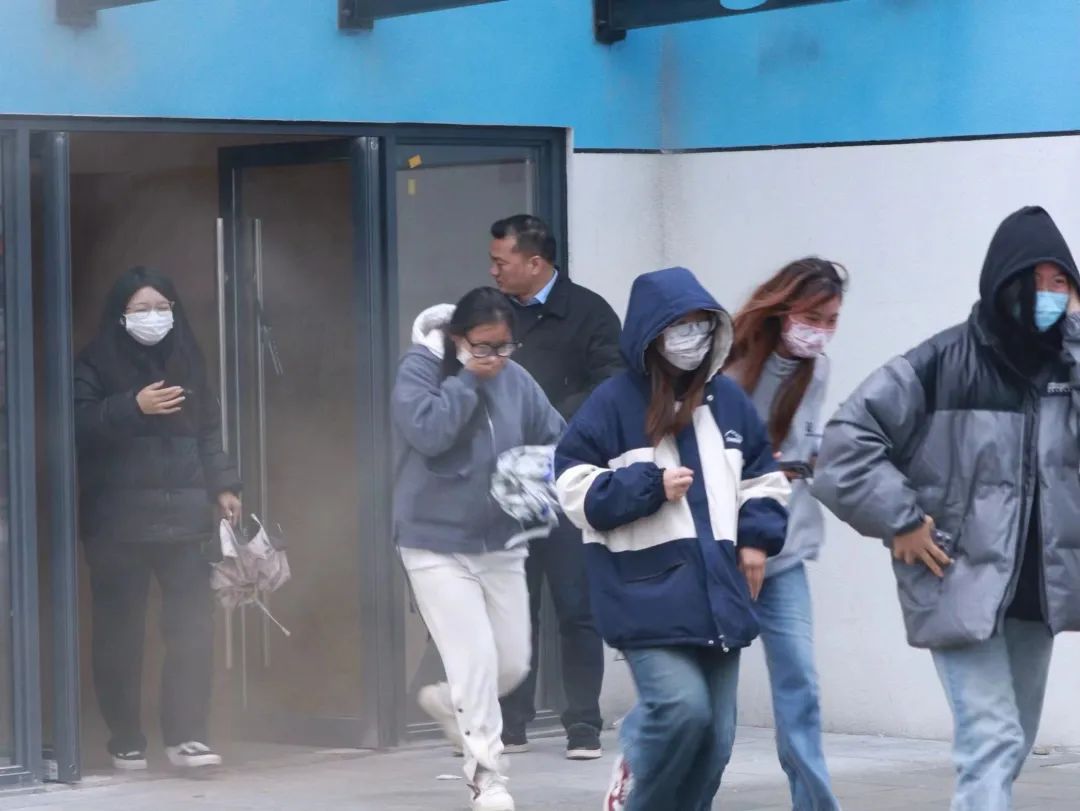 最后进行的是人员疏散逃生演练。在13号宿舍楼内模拟火灾发生,所有人用毛巾或纸巾捂住口鼻,听从现场辅导员的指挥,按照疏散标志和路线,有序疏散,从安全出口撤离到公寓楼外安全区域。疏散过程中,全体同学冷静有序、快速撤离,达到了预期的效果。撤离完毕后,清点人数,确保无一人遗留。