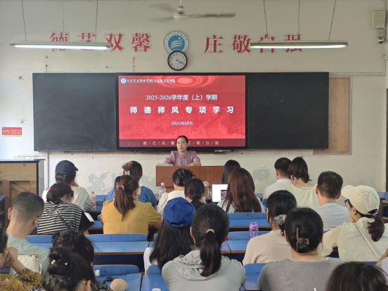 会议伊始,杜彦副院长围绕教学规范与师德师风建设作出具体安排:一是结合学校教学管理规定,系统梳理教学纪律要求,强调全体教师应严格遵循教学流程,规范教学行为;二是明确教师课堂着装标准,要求不得穿着背心、短裤、拖鞋等进入教室,以端庄得体的仪容维护课堂严肃性;三是组织开展师德师风专题学习,通过分享先进典型的育人经验和剖析失范案例,引导教师牢记育人初心、恪守职业准则。