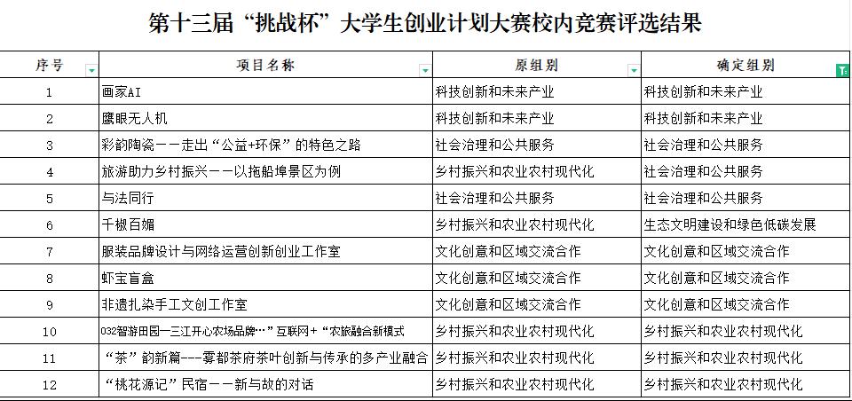 本次校赛共提交项目32项,进入校级终审决赛的项目有12项。通过专家线上评审,最终评选出12个项目参加湖北省第十三届“挑战杯”大学生创业计划竞赛。