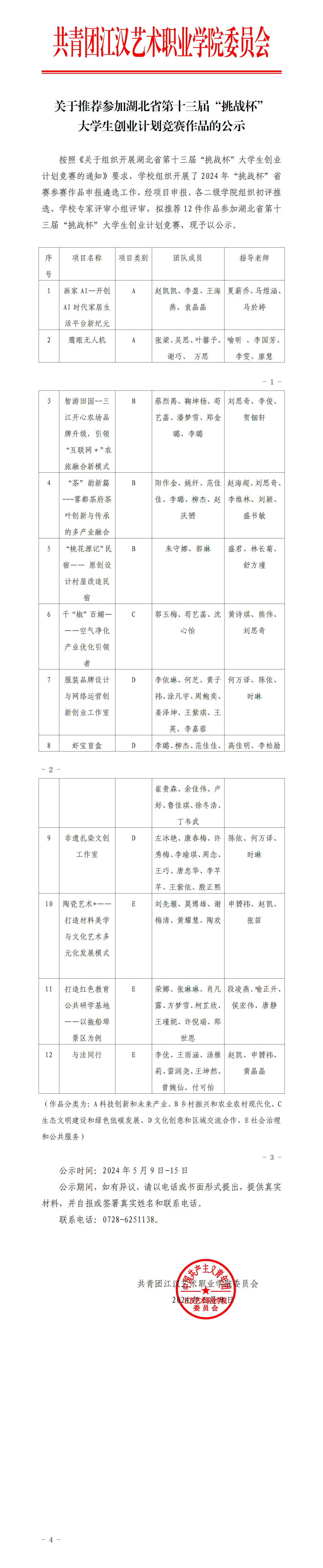 关于推荐参加湖北省第十三届“挑战杯” 大学生创业计划竞赛作品的公示