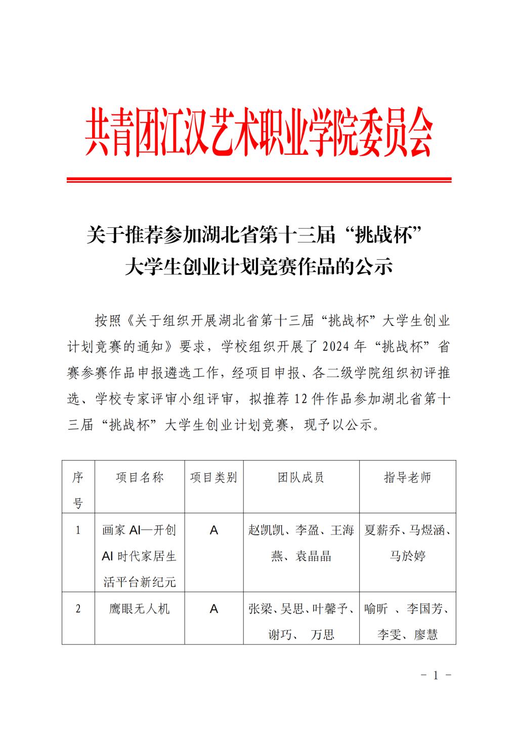 关于推荐参加湖北省第十三届“挑战杯”大学生创业计划竞赛作品的公示(新)