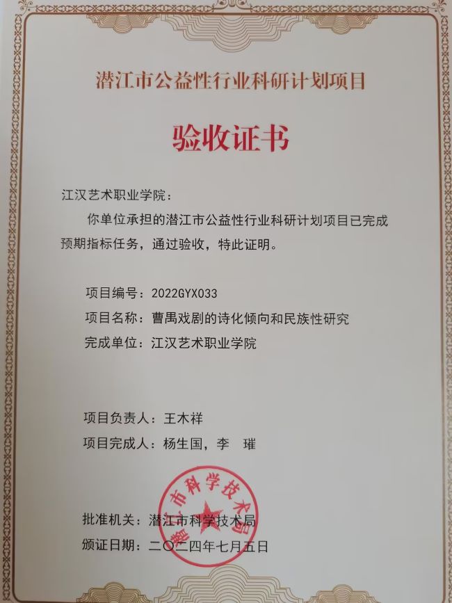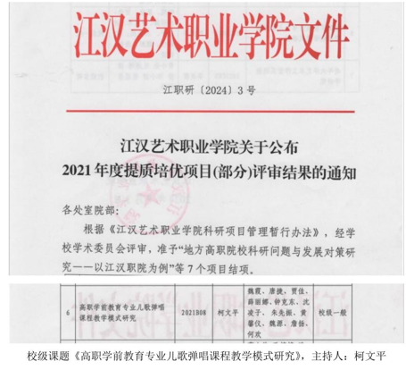 近日,由学前教育学院教师主持的3项课题顺利通过结项验收。其中包括王木祥老师主持的国家级课题《职教新标准下公共基础课改革建设》、市级课题《曹禺戏剧的诗化倾向和民族性研究》和柯文平老师主持的校级项目《高职学前教育专业儿歌弹唱课程教学模式研究》。