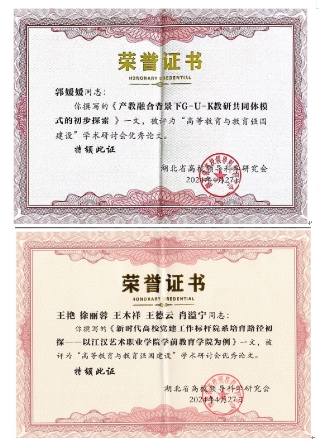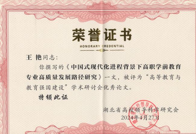 近日,从学校科研处获悉,由学前教育学院选送的3篇论文获评湖北省高校领导科学研究会“高等教育与教育强国建设”学术研讨会优秀论文。