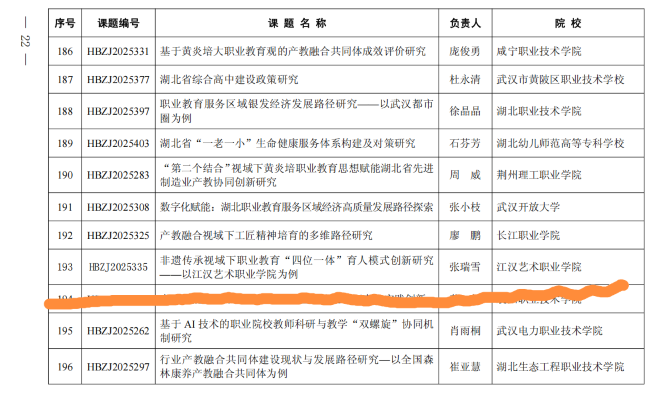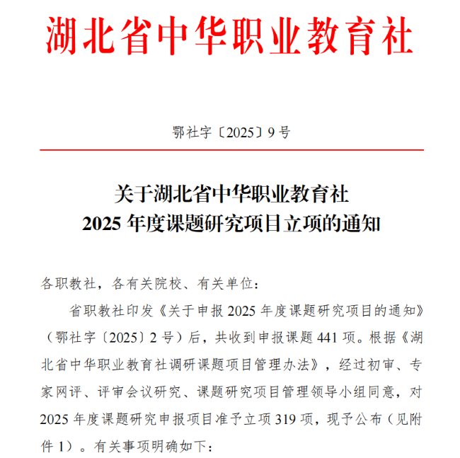 近日,湖北省中华职业教育社公布2025年课题研究项目立项名单。由我院教师张瑞雪主持申报的《非遗传承视域下职业教育"四位一体"育人模式创新研究——以beat365在线体育官网登录入口为例》课题成功获批立项。