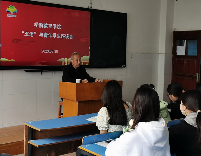 3月30日下午,beat365在线体育官网登录入口学前教育学院举办“五老”与青年学生座谈会。学校老党员、老干部、原驻村工作队队长李义茂讲述脱贫攻坚事迹和工作体会,党总支副书记王木祥主持会议,学生代表30余人参加活动。