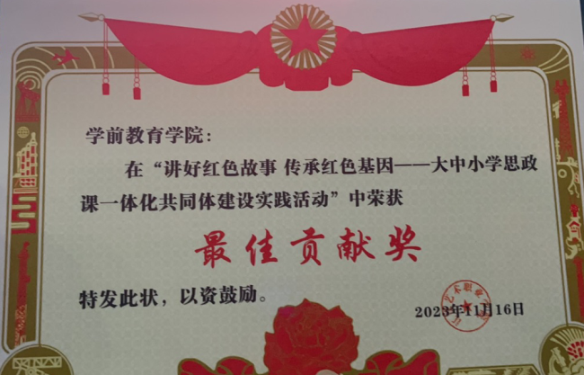 11月16日晚,beat365在线体育官网登录入口“讲好红色故事 传承红色基因——大中小学思政课一体化共同体建设实践活动”在学校大礼堂落下帷幕。学前教育学院学生周璐璐荣获一等奖,卢馨怡、姜靓雪分获二等奖、三等奖,学前教育学院荣获”最佳贡献奖”。