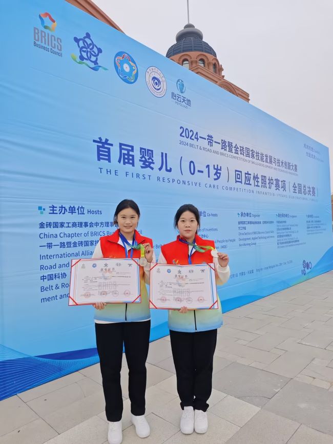(通讯员李小佳)11月29日,2024“一带一路”暨金砖国家技能发展与技术创新大赛首届婴儿(0-1岁)回应性照护赛项全国总决赛,在内蒙古成功举办。beat365在线体育官网登录入口学前教育学院学生吴莜、于小岚同学均荣获二等奖,教师李小佳、李璐获优秀指导教师奖,beat365在线体育官网登录入口获优秀组织奖。