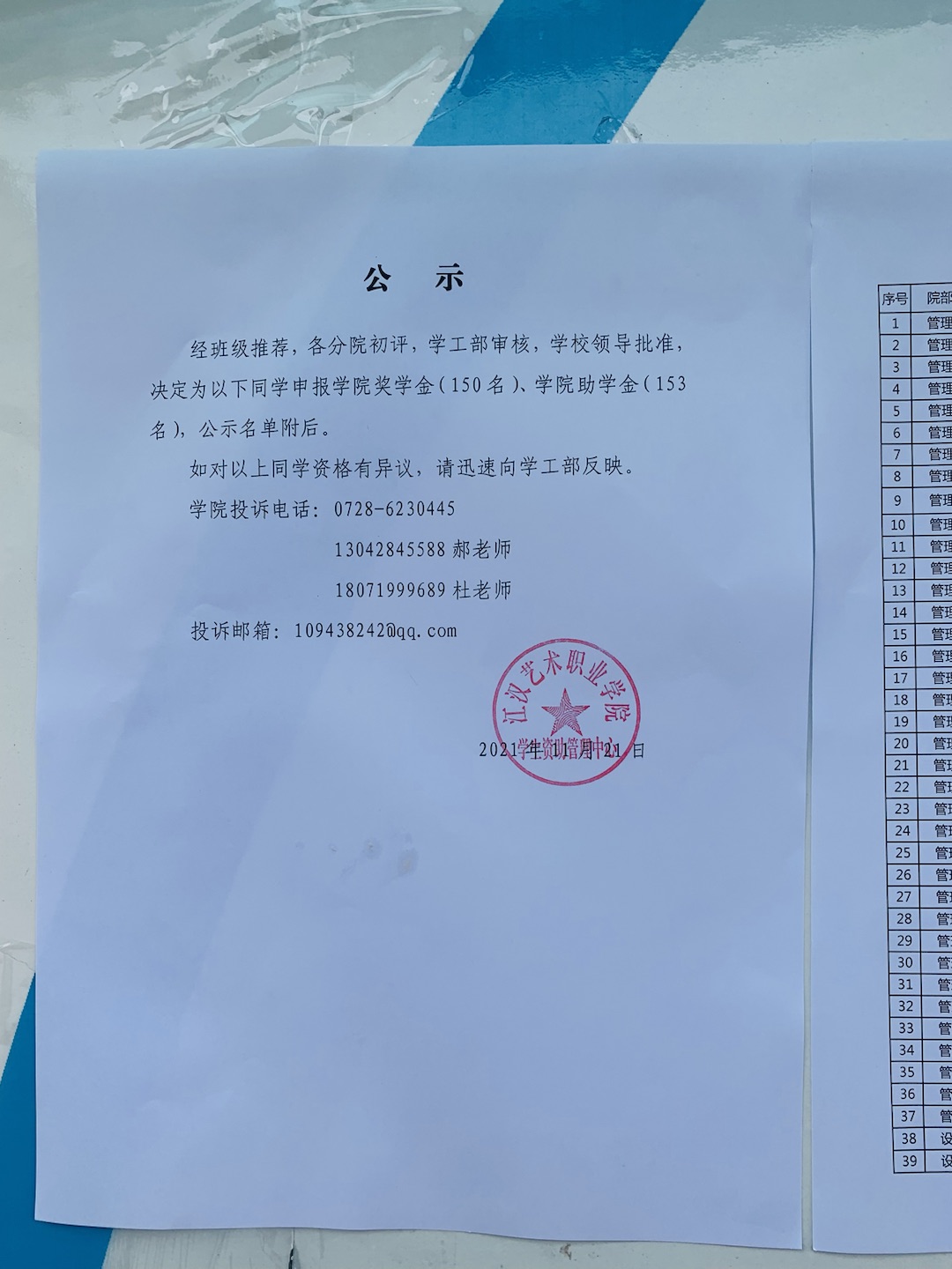经班级推荐,各分院初评,学工部审核,学校领导批准,决定为以下同学申报学院奖学金(150名)、学院助学金(153名),公示名单附后。
