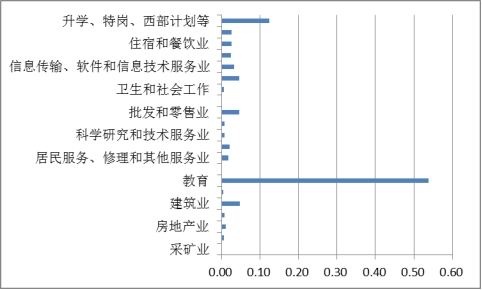 1536人,占比为67.02%, 其次是广东省,就业人数177人,占比为7.72%,接下来是浙江省,就业人数是104人,比例占为4.51%,其他省份就业人数相对较少,人数占比均不足5.0%;对比毕业生就业所在地和生源所在地人数发现,在就业人数最多的湖北省就业的人数与生源地人数相对差距不大。具体如下图所示。