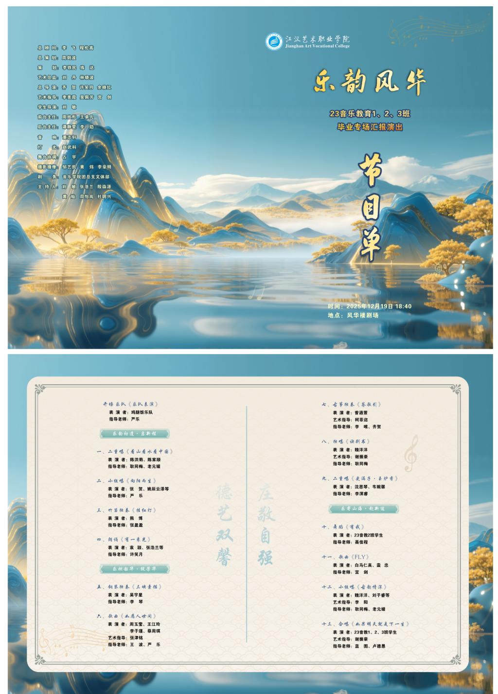 23级音乐教育专业1、2、3班毕业专场汇报演出于2025年12月19日19:00在风华楼剧场举行。